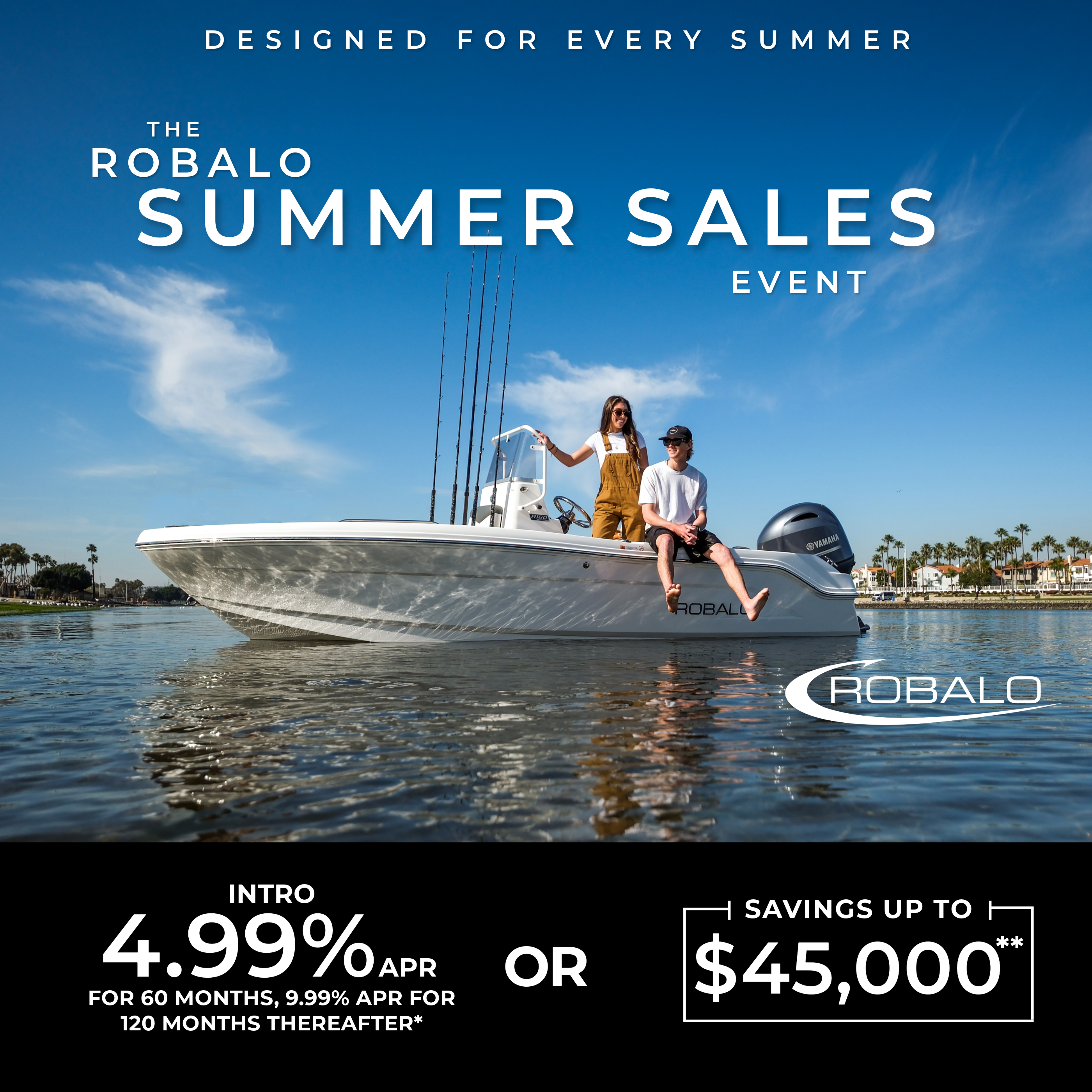 *Available on new (unused, not previously warranty registered) eligible 2023 - 2025 Robalo Boat models only for qualified tier 1 credit customers who reside in the U.S.A. only (not available in all states) and finance through Yamaha Motor Finance Corporation, U.S.A. Offer valid 10/1/2025 – 12/31/2025. An introductory 4.99% APR for tier 1 financing for 60 months at $7.90 per month per $1,000 financed; thereafter 9.99% APR for 120 months at $9.85 per $1,000 financed. Not all buyers will qualify. Promotional rates are based on creditworthiness. Higher financing rates apply for buyers with lower credit ratings.