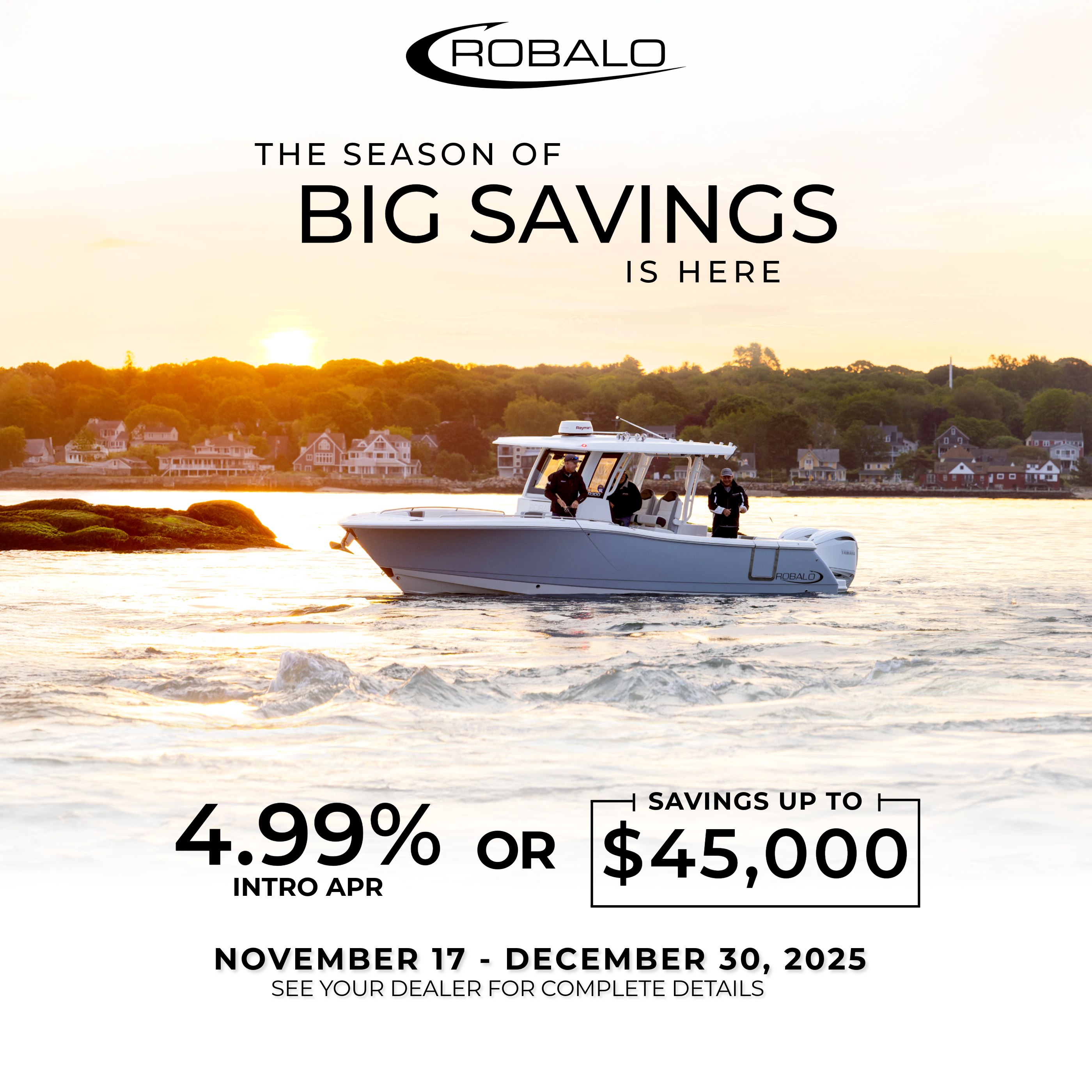 Savings incentives are shown in USD and are valid on new (unused, not previously warranty registered) Robalo Boats models sold and delivered between 11/17/2025 – 12/31/2025. Eligible models and incentive amounts are predetermined and vary by model. All incentives are subject to availability and Robalo Boats reserves the right to modify or terminate this promotion at any time without notice. This offer cannot be combined with any other promotions or discounts. Contact your participating dealer for further details.