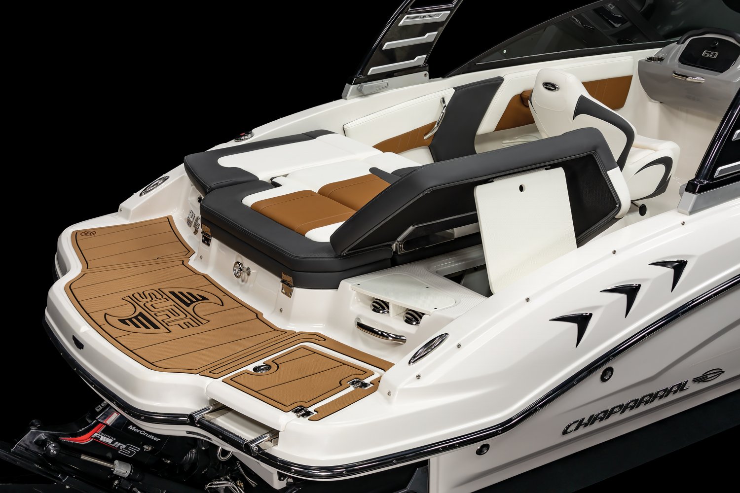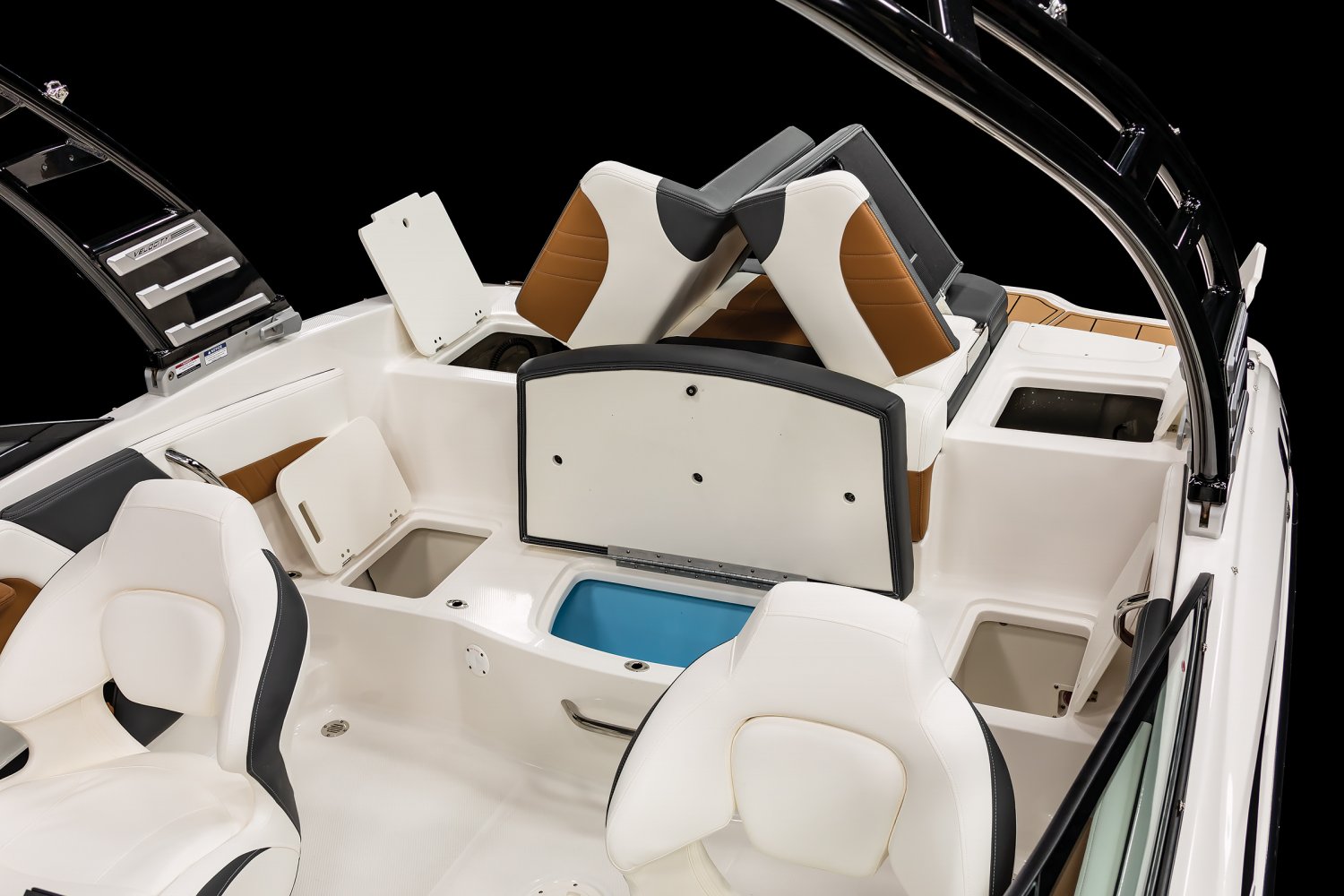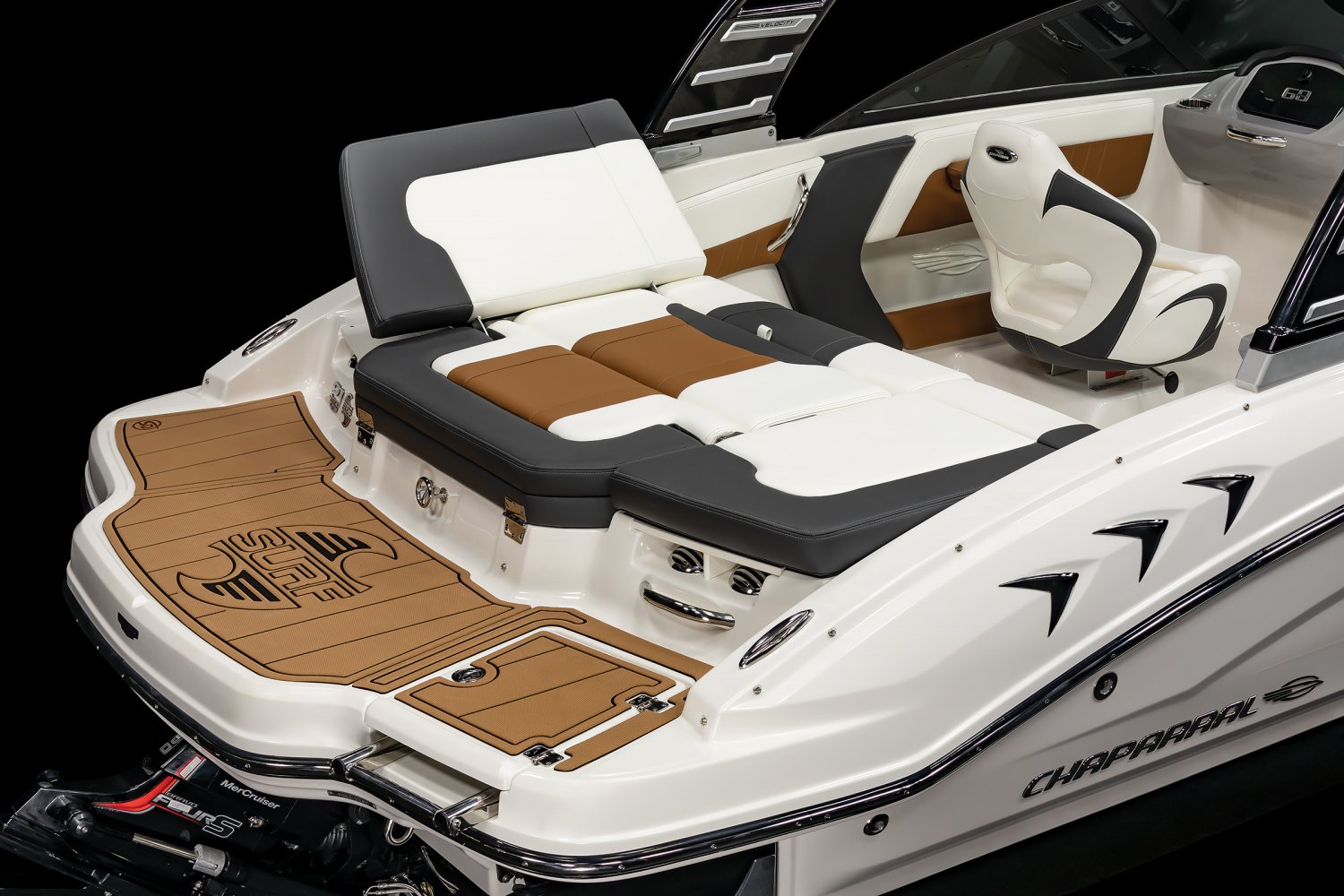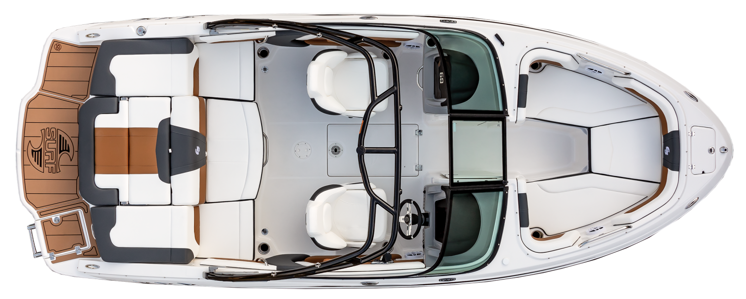 Cockpit Layout: Two Bucket Seats (Slide and Swivel) with Logo Badging, Rear Bench Seat and Aft Hinged Sundeck with Walk-Thru, Lounge Position and Aft Facing Seat