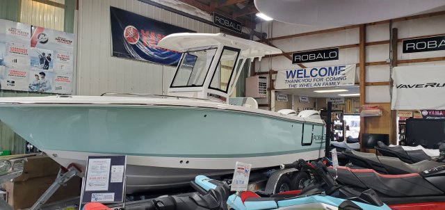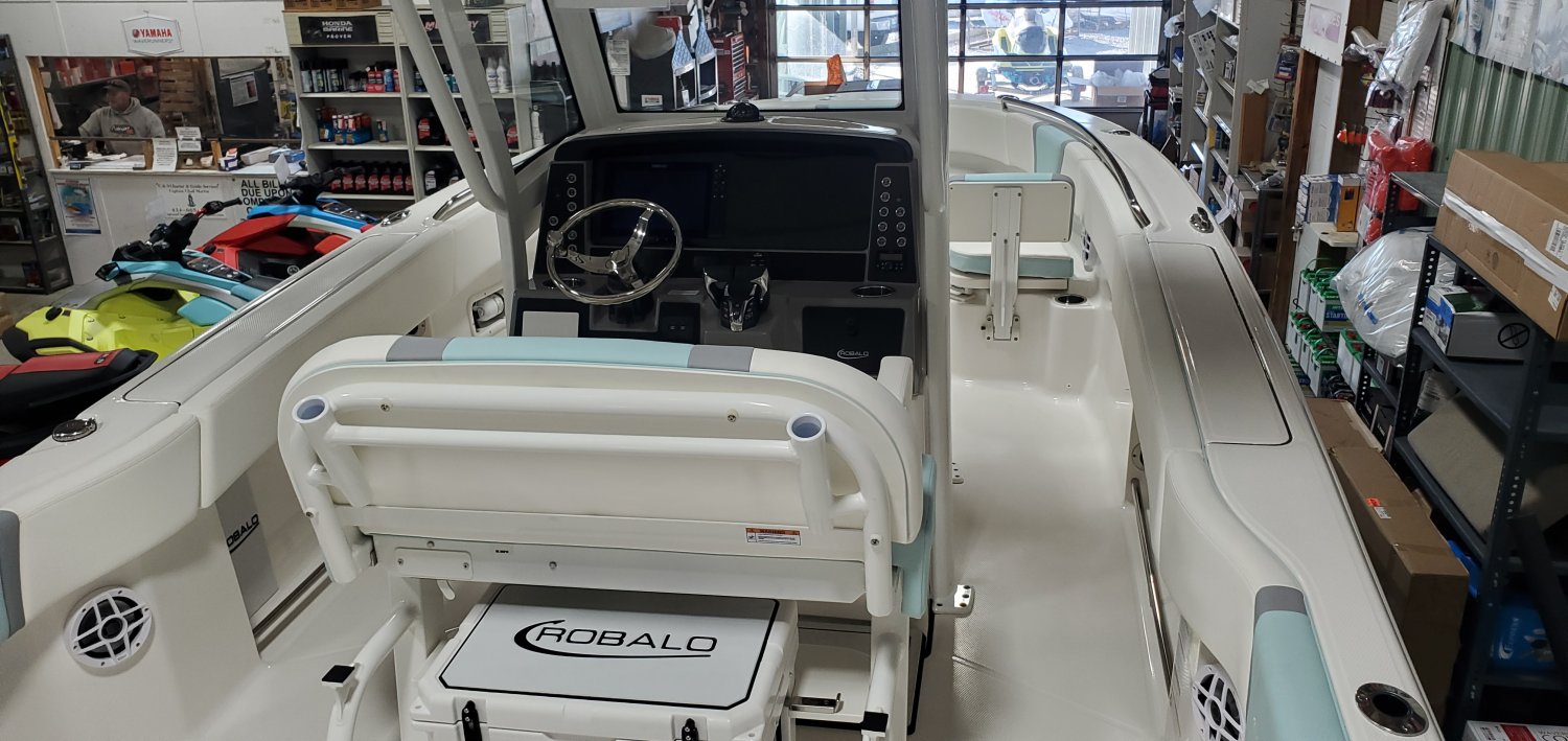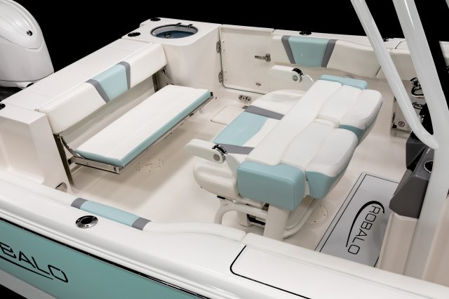 The sensational R250 is Robalo's newest center console offering available at No Haggle, Reel Deal pricing. Brace yourself, fish boat design just took another giant leap forward. Upfront, the large casting platform is sure-footed and accessible. In the cockpit, a forward entry privacy head comes standard with a porta-pottie and a screened opening port light. Little extras like LED cockpit lighting, a bow filler cushion and a freshwater cockpit shower are all standard. Serious anglers will appreciate the best-in-class livewell capacity and massive insulated fish box storage. At this length, nobody does it bigger or better. Fully equipped standard, take the R242 up a notch with key options including a fiberglass T-top that comes complete with four rod holders, LED spreader lights and an electronics box.