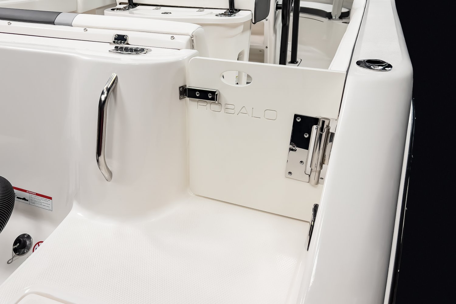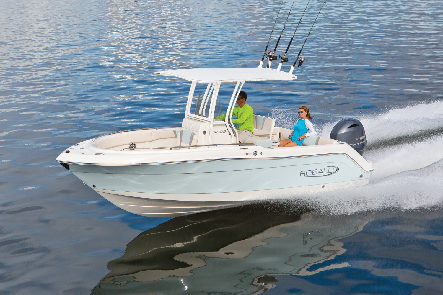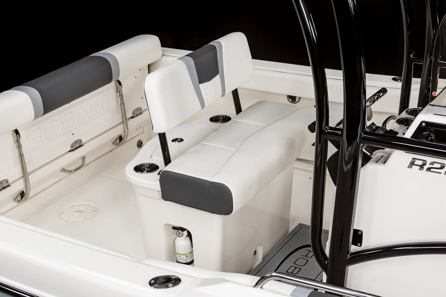 It had to happen. Parlaying the game-changing success of the R180 and the R200, Robalo takes its center console offerings up a notch with the introduction of the new R222. The R222 is sold at a nationally advertised price. The keyword here is more. More centerline length. More storage space. More ride comfort. More seaworthiness. More fishing features. The only place where the new R222 proudly comes up short is its Reel Deal price tag. Key fishing features include twin 30-gallon fish boxes that can either keep your catch fresh or serve as storage areas. A 15-gallon livewell with LED lighting and a blue gelcoat finish is conveniently positioned under the standard leaning post.