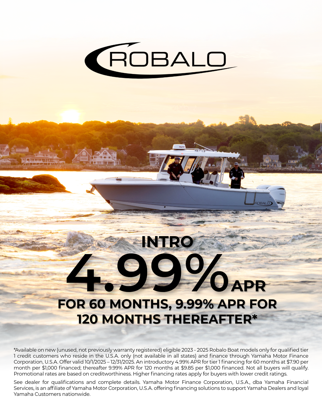 ROBALO REEL DEAL PRICING DOES NOT INCLUDE OPTIONS, DEALER PREP AND FREIGHT CHARGES. FEES FOR DEALER INSTALLATION OF OPTIONS, TAXES, TITLE, REGISTRATION, DOCUMENTATION AND LICENSING MAY VARY BY LOCATION AND ARE IN ADDITION TO PRICES SHOWN. PRICES SHOWN MAY INCLUDE MOTORS THAT HAVE LIMITED AVAILABILITY. ALL PRICING SHOWN IN USD. PHOTOS MAY SHOW OPTIONAL EQUIPMENT. SOME TRAILERS, EQUIPMENT OR ENGINES OFFERED MAY NOT BE AVAILABLE IN SOME AREAS OR REQUIRE ADDITIONAL EQUIPMENT AT AN ADDED COST. OPTIONS, STANDARD EQUIPMENT AND PRICES ARE SUBJECT TO CHANGE WITHOUT NOTICE OR IMPLIED OBLIGATION. SEE YOUR DEALER FOR DETAILS. ROBALO IS CONSTANTLY SEEKING WAYS TO IMPROVE THE SPECIFICATION, DESIGN, AND PRODUCTION OF ITS BOATS. ALTERATIONS TAKE PLACE CONTINUALLY. WHILE EVERY EFFORT IS MADE TO PRODUCE UP-TO-DATE INFORMATION, THIS WEBSITE SHOULD NOT BE REGARDED AS AN INFALLIBLE GUIDE TO CURRENT SPECIFICATIONS, NOR DOES IT CONSTITUTE AN OFFER FOR THE SALE OF ANY PARTICULAR BOAT. YOUR AUTHORIZED ROBALO DEALER CAN CONFIRM MATERIALS, ACCESSORIES AND EQUIPMENT AVAILABILITY PRIOR TO PURCHASE. ROBALO RESERVES THE RIGHT TO CHANGE PRODUCT SPECIFICATIONS AT ANY TIME WITHOUT INCURRING OBLIGATIONS.