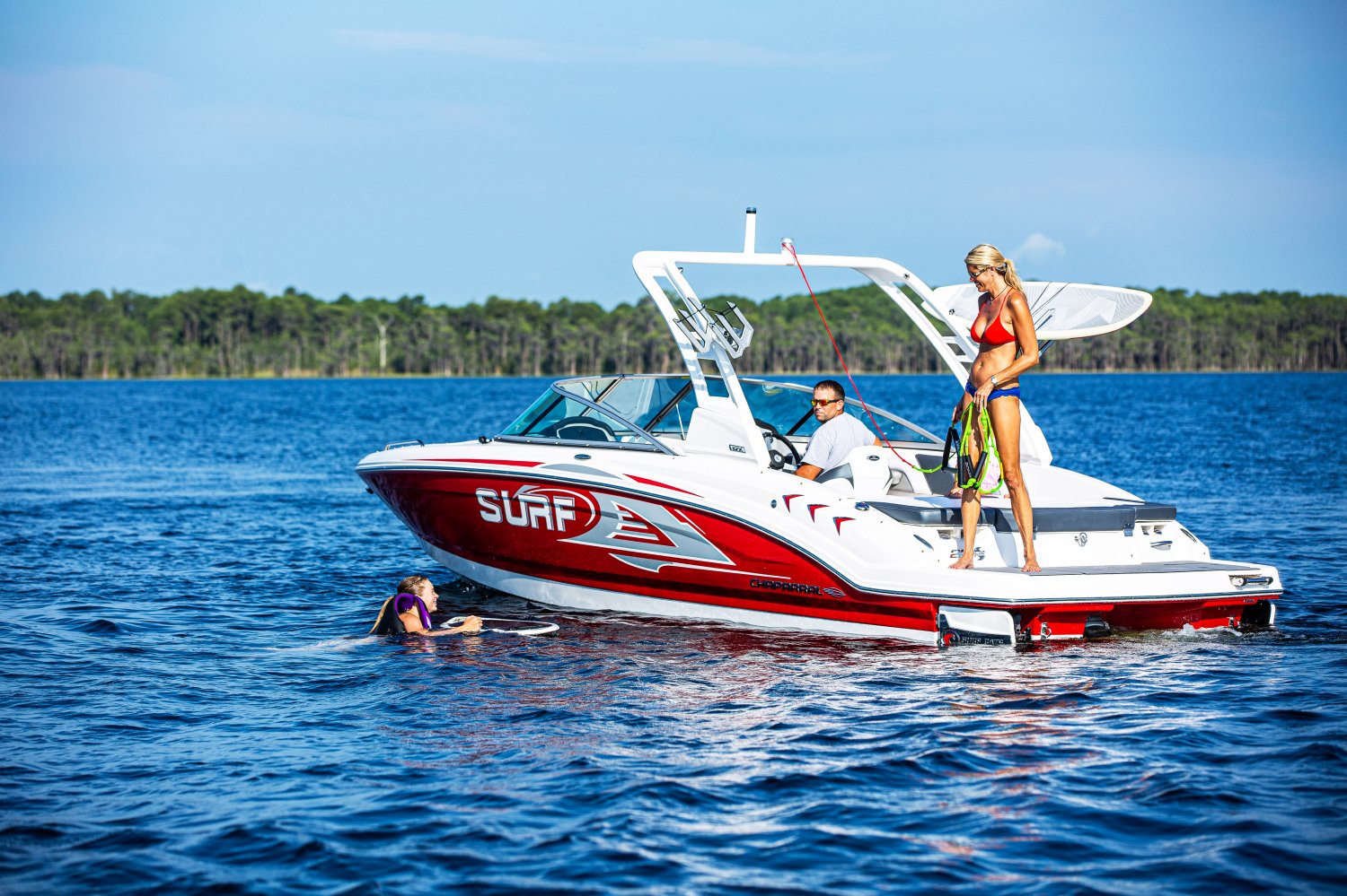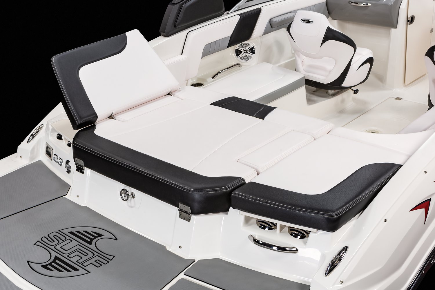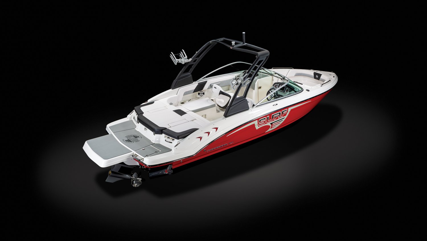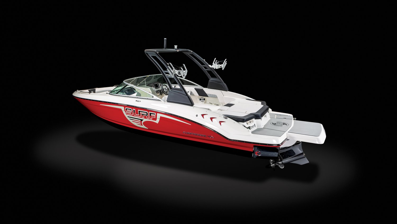 Gel Coated Entire Hull - Black Surf Logo Graphic Volvo V-6 Gen V 2.32 DP FFD 280HP Cockpit Interior - Sterling Velocity Folding Arch Tower - Black Tower Top Canvas Mooring Cover Ultra-Comfort Pedestal Seat with Flip-Up Bolster - Helm Ultra-Comfort Pedestal Seat with Flip-Up Bolster - Passenger Transom Stereo Remote Bow Walk Thru Door Beach Weave Snap-In Flooring Swim Platform Custom Surf Logo Mat - Extended Platform Cockpit Table with Side Mount Bases Pull-Up Cleats Extended Swim Platform Board Racks - Swiveling Ballast System Prep Fee 5 Year Premier Level Limited Component Warranty Standard Trailer