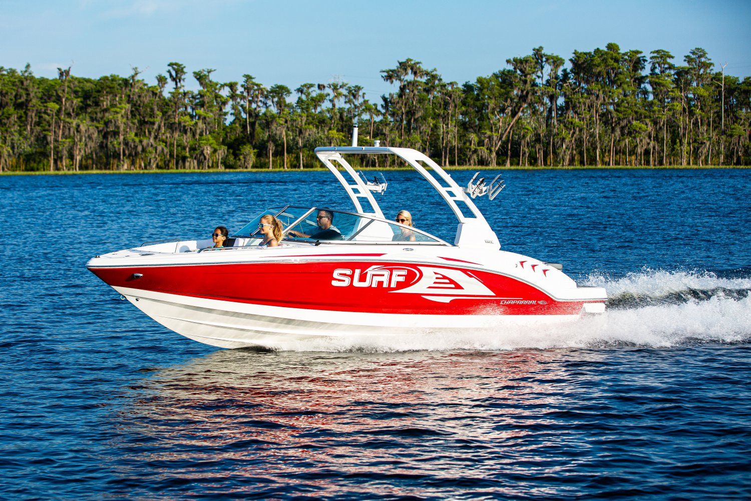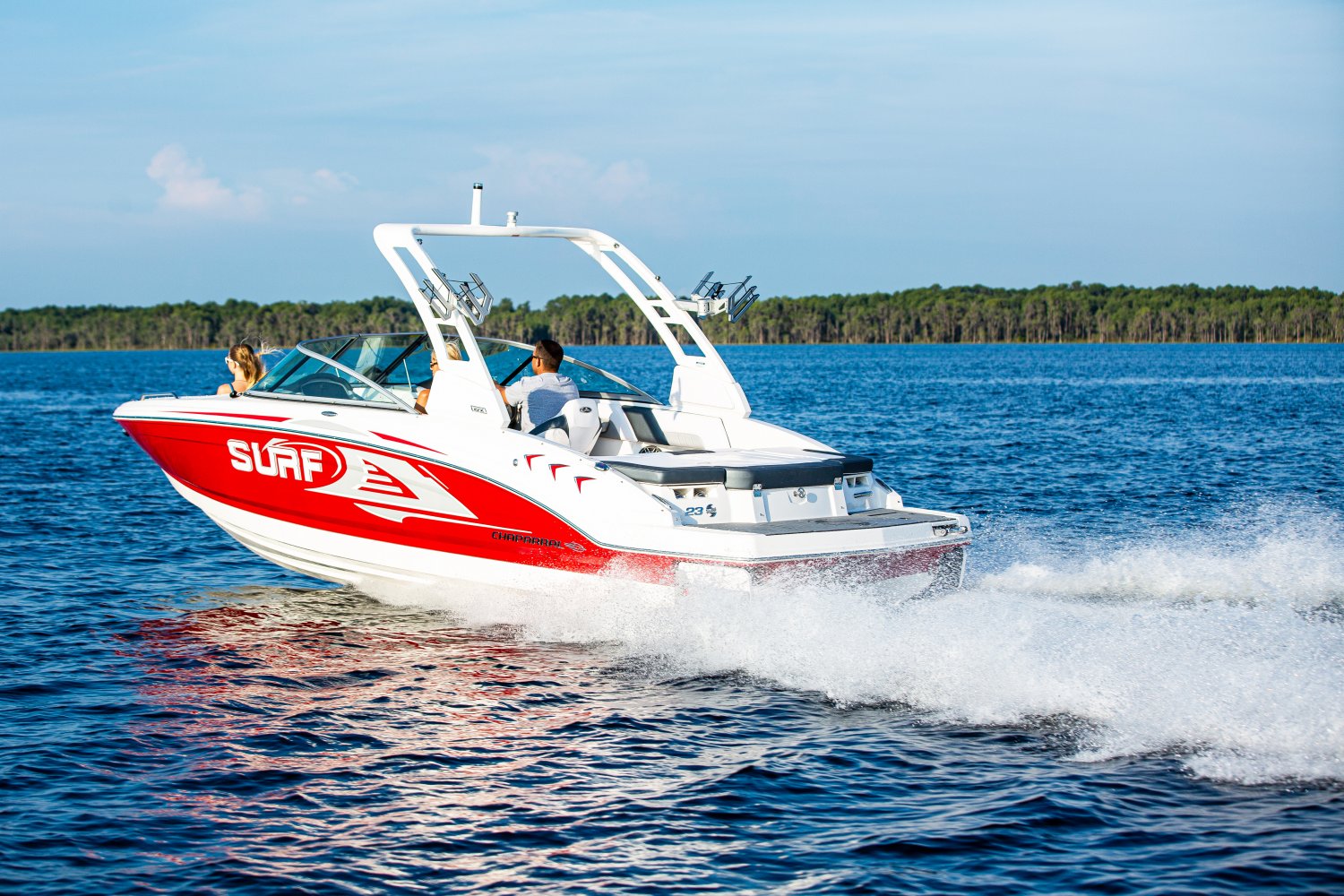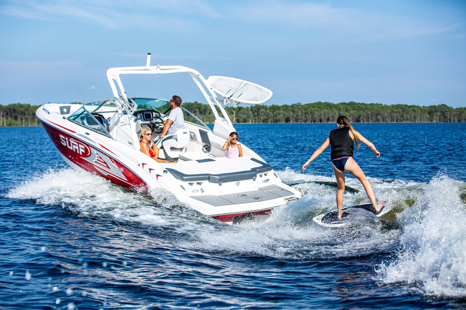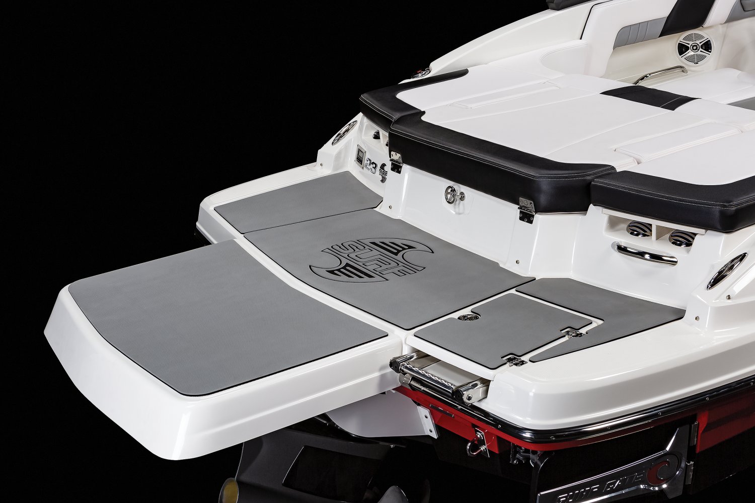 Gel Coated Entire Hull - Black Surf Logo Graphic Volvo V-6 Gen V 2.32 DP FFD 280HP Cockpit Interior - Sterling Velocity Folding Arch Tower - Black Tower Top Canvas Mooring Cover Ultra-Comfort Pedestal Seat with Flip-Up Bolster - Helm Ultra-Comfort Pedestal Seat with Flip-Up Bolster - Passenger Transom Stereo Remote Bow Walk Thru Door Beach Weave Snap-In Flooring Swim Platform Custom Surf Logo Mat - Extended Platform Cockpit Table with Side Mount Bases Pull-Up Cleats Extended Swim Platform Board Racks - Swiveling Ballast System Prep Fee 5 Year Premier Level Limited Component Warranty Standard Trailer