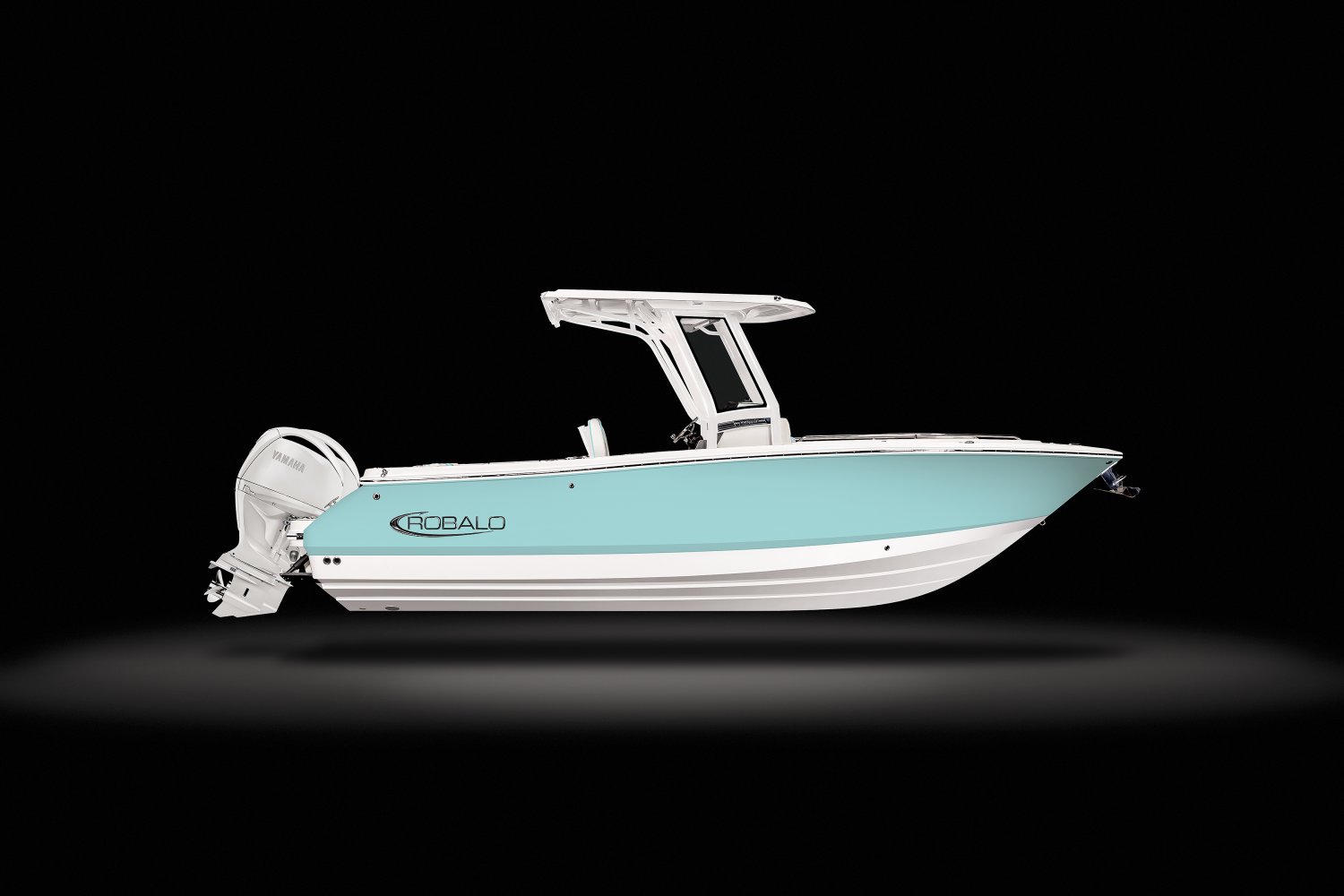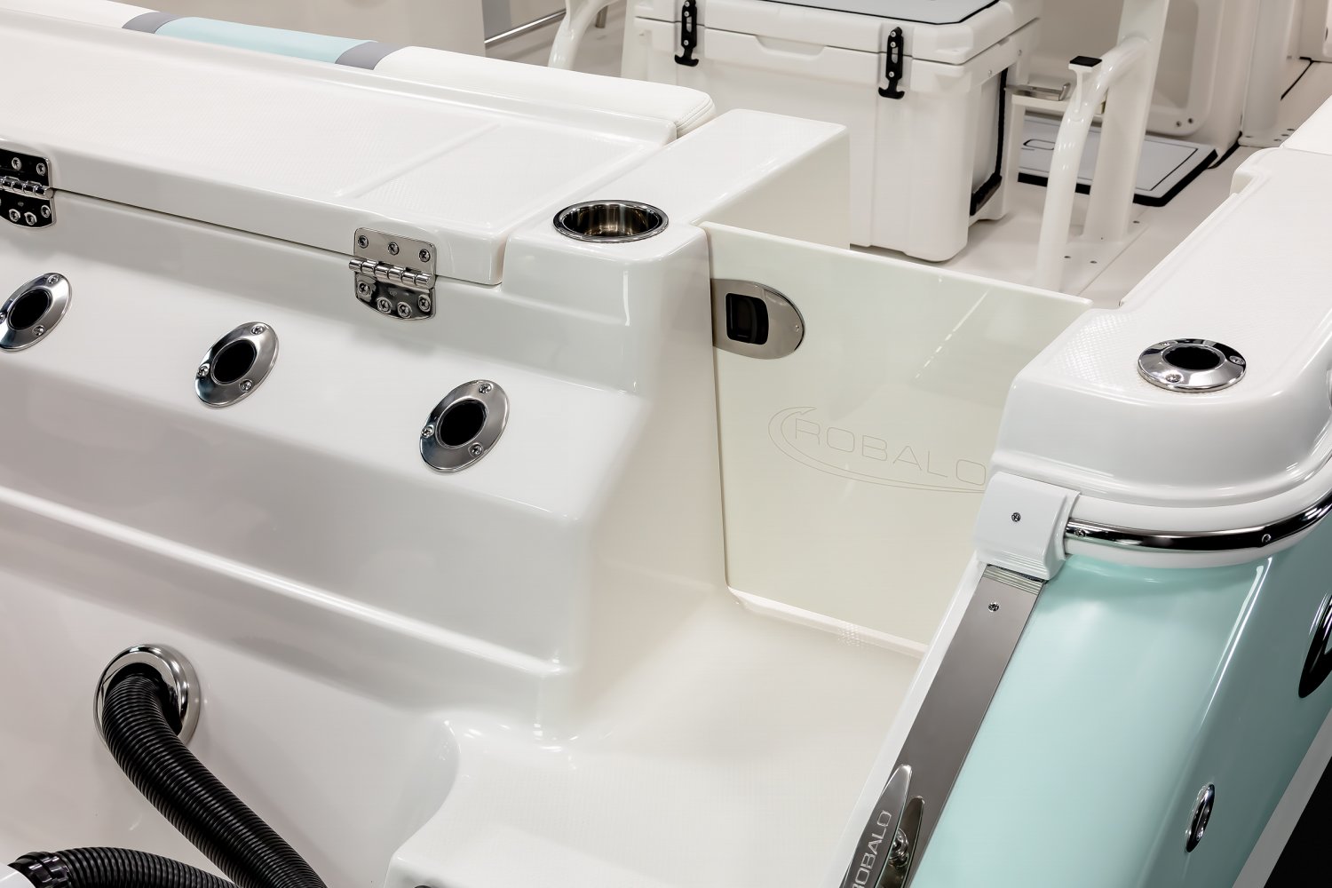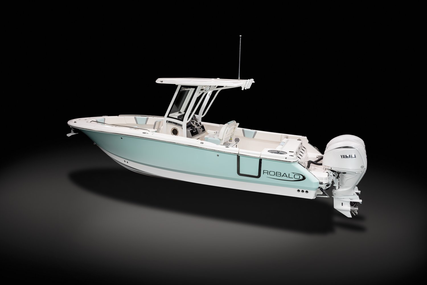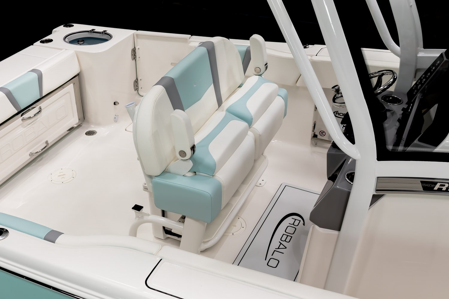 The sensational R250 is Robalo's newest center console offering available at No Haggle, Reel Deal pricing. Brace yourself, fish boat design just took another giant leap forward. Upfront, the large casting platform is sure-footed and accessible. In the cockpit, a forward entry privacy head comes standard with a porta-pottie and a screened opening port light. Little extras like LED cockpit lighting, a bow filler cushion and a freshwater cockpit shower are all standard. Serious anglers will appreciate the best-in-class livewell capacity and massive insulated fish box storage. At this length, nobody does it bigger or better. Fully equipped standard, take the R242 up a notch with key options including a fiberglass T-top that comes complete with four rod holders, LED spreader lights and an electronics box.
