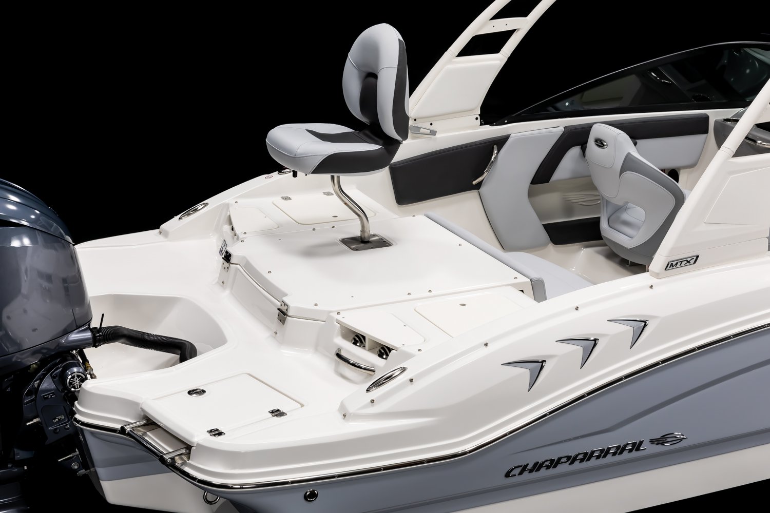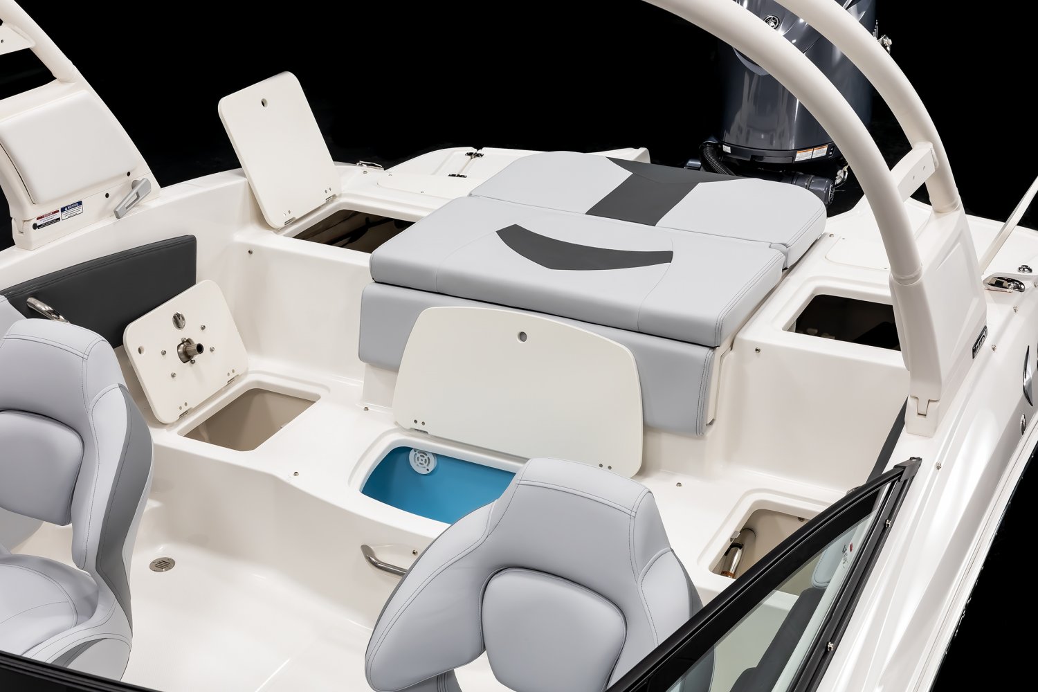 • Cockpit Layout: Two Bucket Seats (Slide and Swivel) with Logo Badging, Rear Removable Fishing Seats and Aft Hinged Sundeck with Storage Below