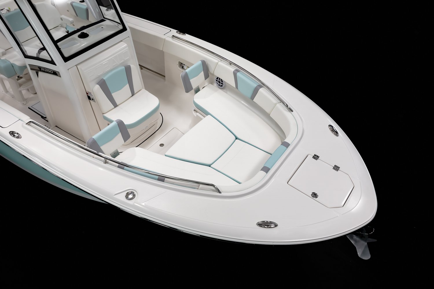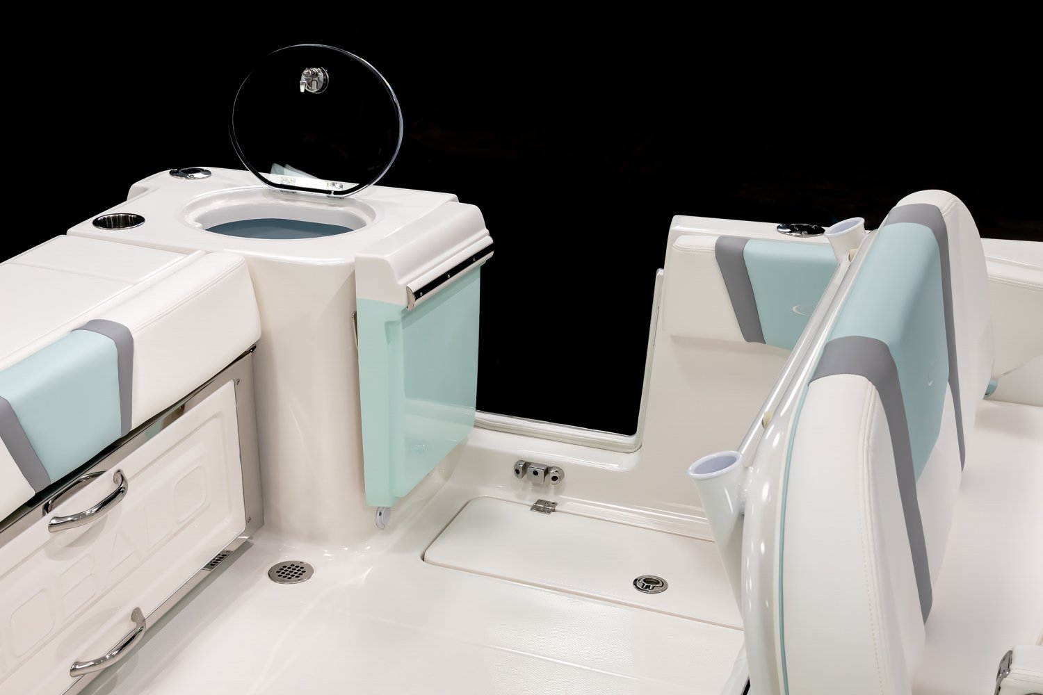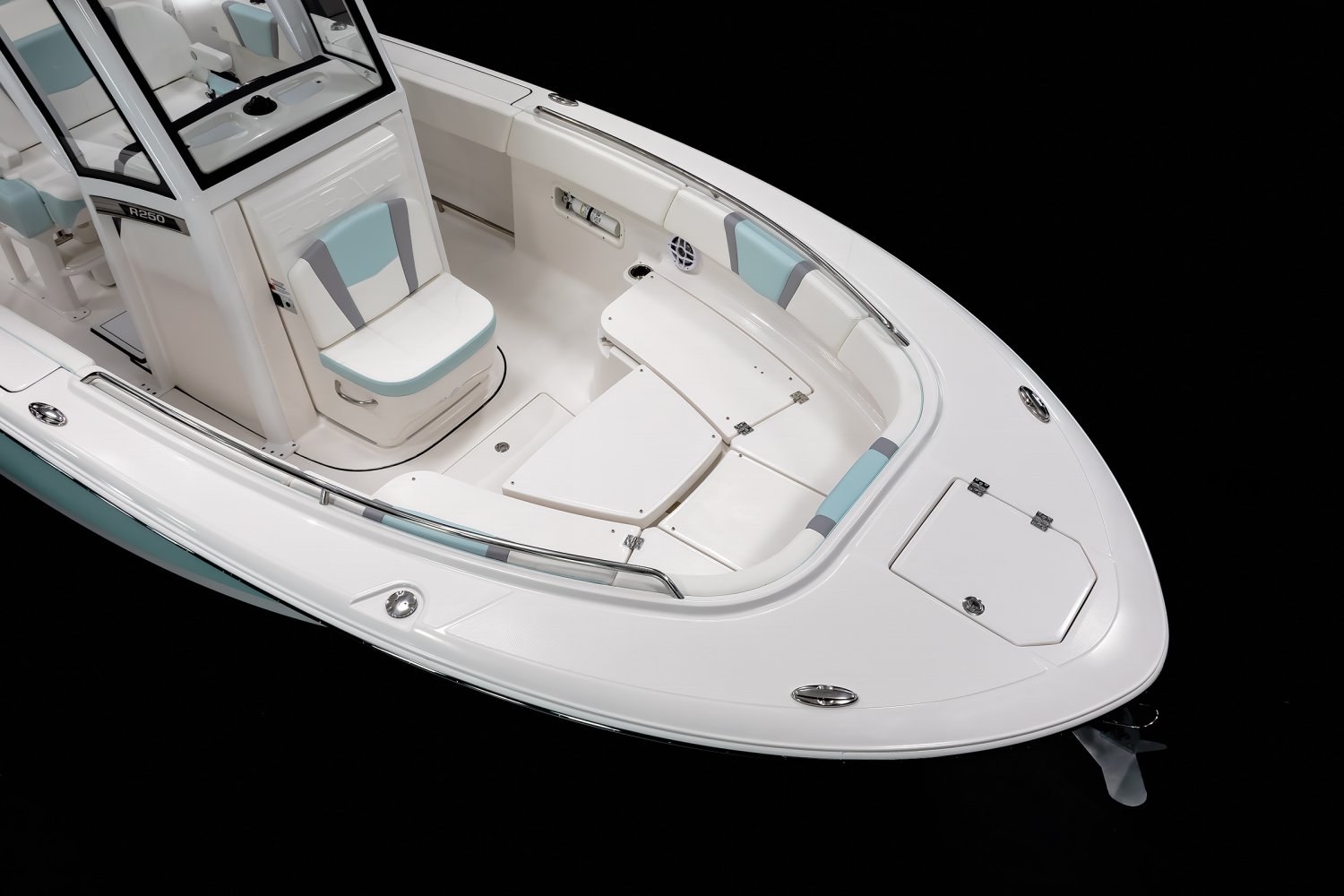 The cockpit of the R250 was built for the avid fisherman. The cockpit houses 2 50-gallon insulated fish boxes and a 30-gallon livewell with built-in LED lighting. Between the standard T-Top and the transom wall, there are 10 rod holders, with more being located around the boat. With the optional twin Simrad touchscreen displays installed, all the engine and navigation information are just a swipe away.