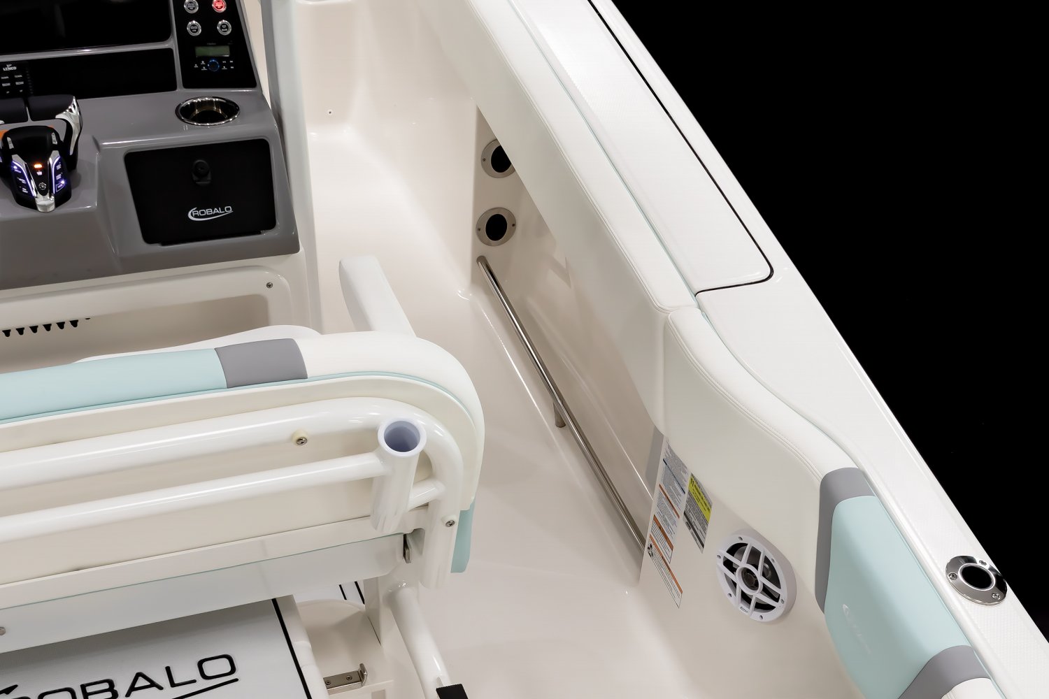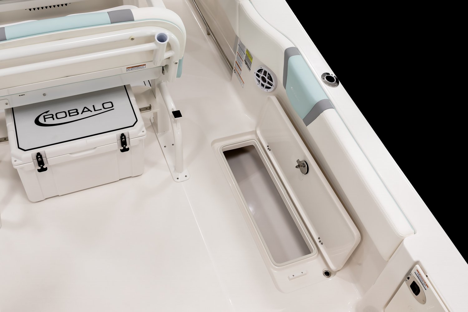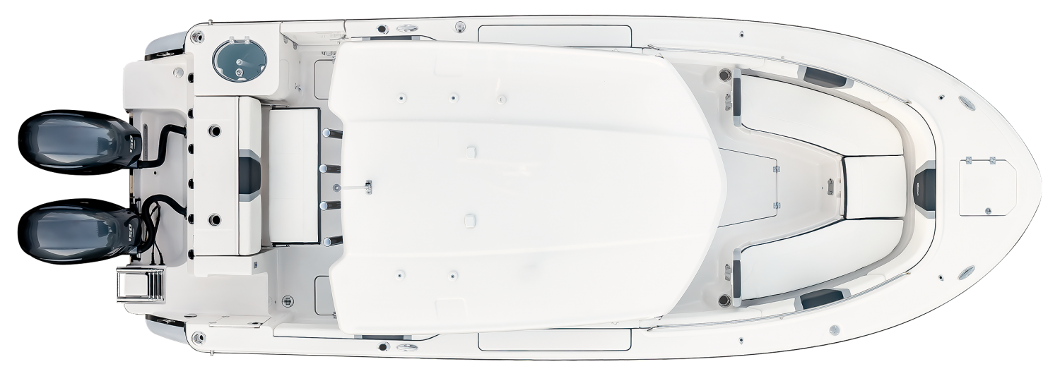 The cockpit of the R250 was built for the avid fisherman. The cockpit houses 2 50-gallon insulated fish boxes and a 30-gallon livewell with built-in LED lighting. Between the standard T-Top and the transom wall, there are 10 rod holders, with more being located around the boat. With the optional twin Simrad touchscreen displays installed, all the engine and navigation information are just a swipe away.